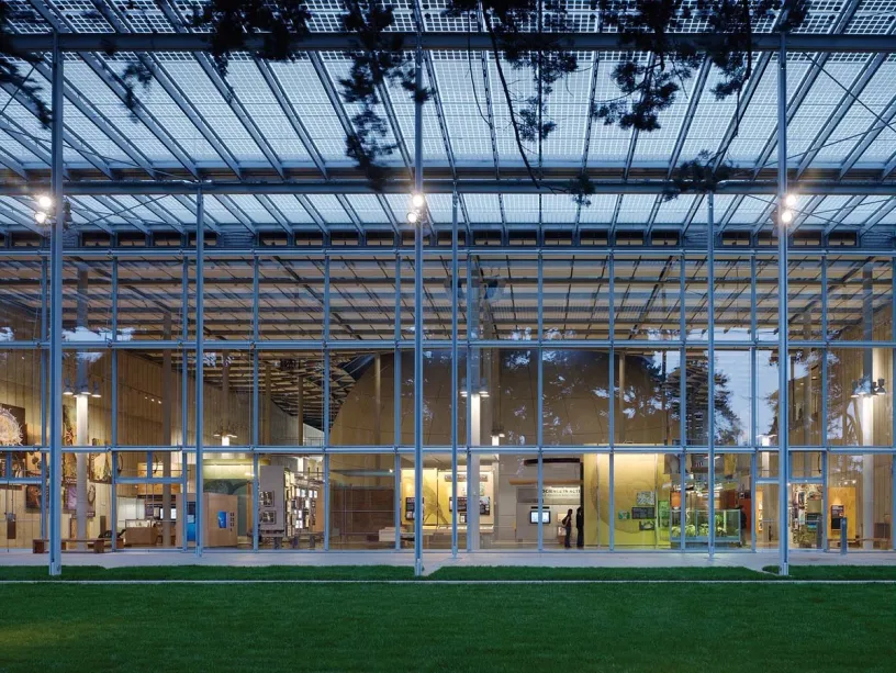 Photovoltaic cells are embedded between the two glass panels forming the transparent canopy around the green roof's perimeter. These 60,000 cells generate over 5% of the museum’s electricity needs. The project’s material choices, including 20,000 cubic yards of recycled concrete, 11 million pounds of recycled steel, and wall insulation made from denim scraps, were integral to its sustainability goals. Combined with optimal spatial orientation, natural lighting and ventilation, water usage strategies, rainwater recovery, and energy production, these efforts earned the museum LEED Platinum certification—the first for a museum.